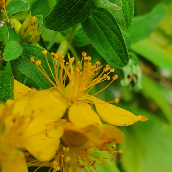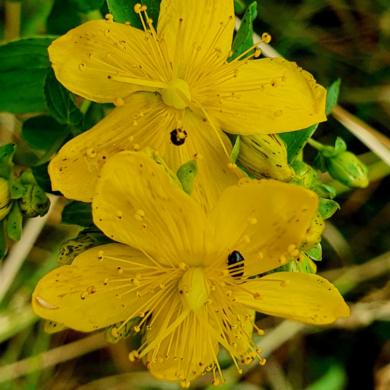 Auf den Blütenblättern des Johanniskrauts befinden sich winzige Farbdrüsen, die bei genauer Betrachtung als schwarze Punkte erkennbar sind.