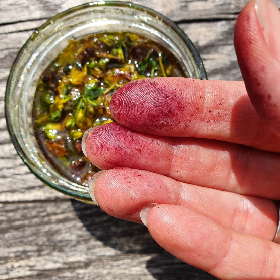 Bei Verwendung des Rotöls bitte direktes Sonnenlicht meiden. Johanniskraut kann PHOTOTOXISCH wirken bei Kontakt mit UV Strahlung und Hautreizungen und Sonnenbrand auslösen.